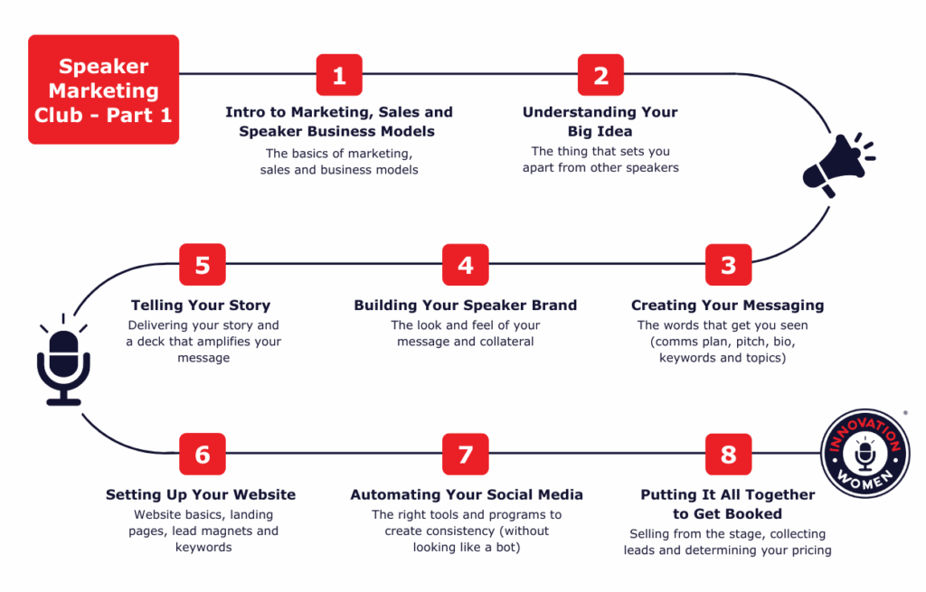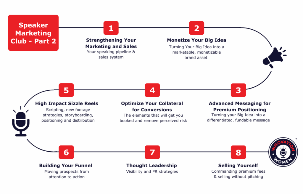 Ready to take your speaking career to the next level? Join Speaker Marketing Club from Innovation Women. We have developed a comprehensive learning program with expert instructors, downloadable resources and facilitated co-working. These sessions will equip you with the tools, strategies and insights to create a professional speaker marketing program and teach you how to use speaking as marketing.